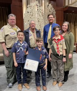 (Pictured above – 2024 Scout Shabbat, front row: Liam D. from Pack 805 – holding certificate flanked by brothers Owen D. and Nathan D.; back row, Ken Etter – Advisor to the Council Jewish Committee on Scouting, Earl Binder, Chair, Council Jewish Committee on Scouting, Liam’s parents)