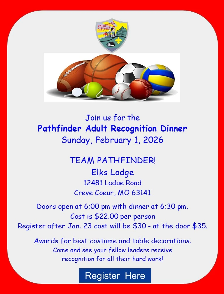 Pathfinder February Banquet Sunday February 22nd at Salem Methodist Church, 1200 S Lindbergh Blvd (go in glass doors at back of church). Doors open at 5 pm and program begins at 5:30 pm. Dinner will be catered by Pasta House. Enjoy fellowship, announcement of the 2026 Sophir Arrowman of Year award winners and play a game of Tringo (trivia plus bingo). Cost is $19 Brothers / $15 for CEM/Ceremonialists until February 8th (after that $24/$19). Registration on Hub51 here. https://shawneelodge.app.neoncrm.com/event.jsp?event=353&