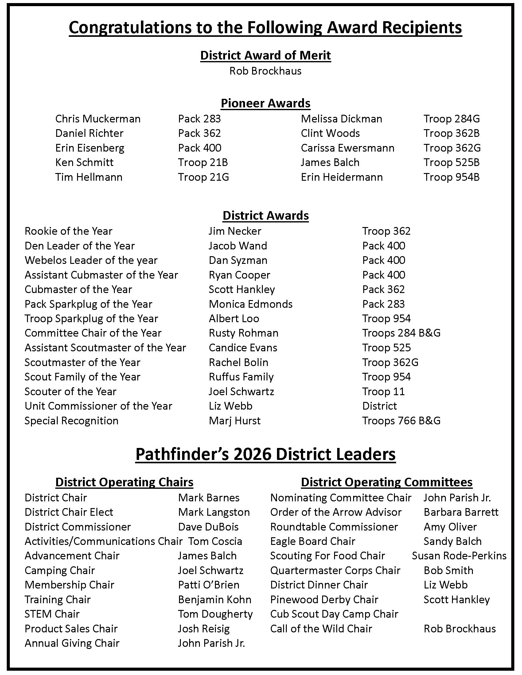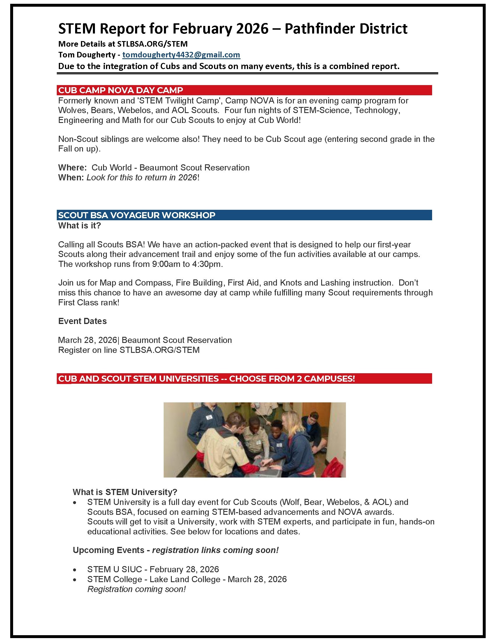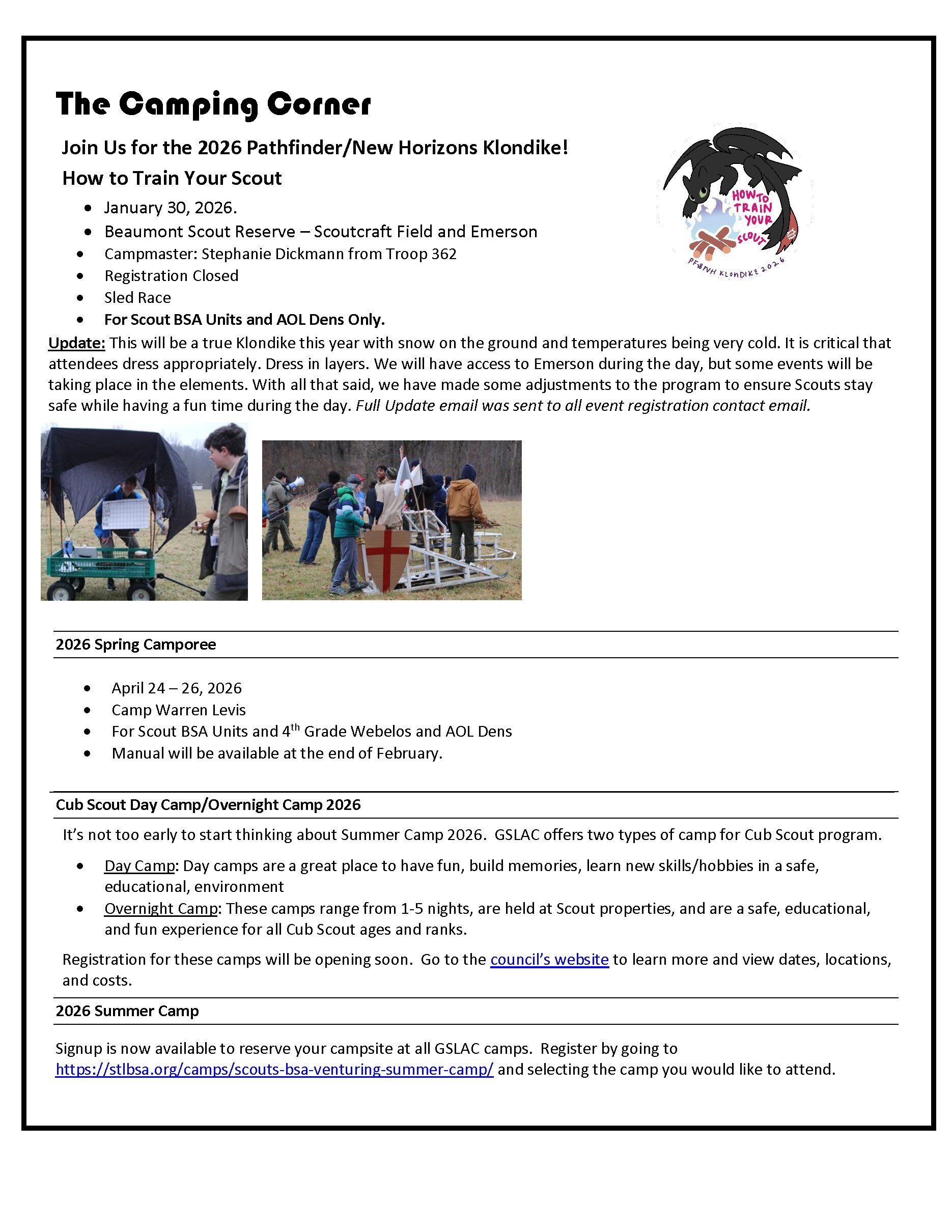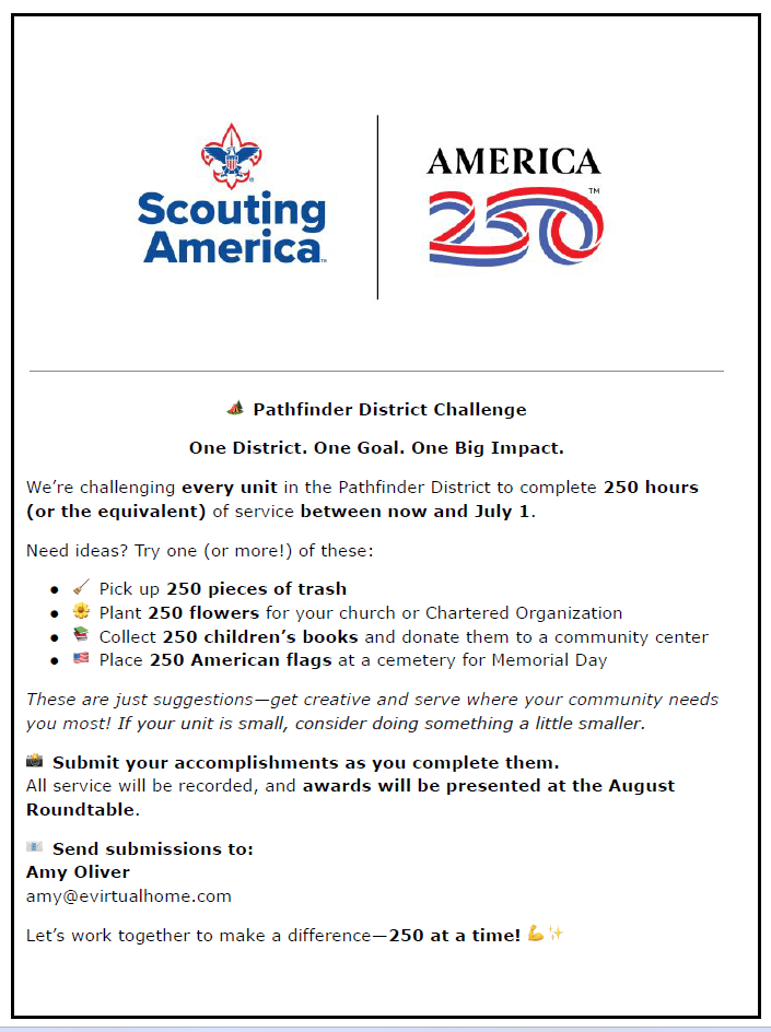 Looking forward to March we will help with the Pinewood Derby on March 7 at Maplewood Richmond Heights from 9 am – 2 pm. This is a service project where we will help with the races and provide entertainment between races. We will also promote Scouts BSA and encourage all AOLs to crossover to a Troop. This is a service project and sign-up sheet will be forthcoming.