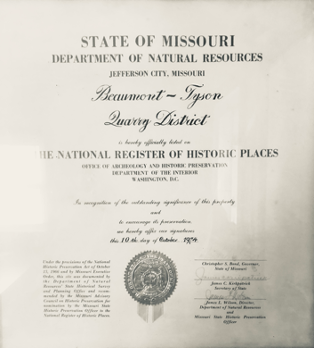 Beaumont Scout Reservation is part of the Beaumont-Tyson Quarry District and is officially listed on the National Register of Historic Places by the Office of Archeology and Historic Preservation Department of the Interior, Washington D.C.