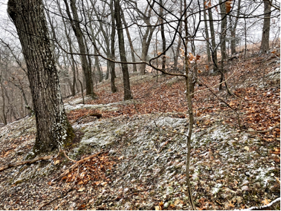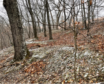 Our journey continues with walking Beaumont Scout Reservation Road to the Tomahawk Trail. After hiking up the hill and reaching the Antire Ridge you will find small craters or pits scattered on either side of the trail. These pits are actually Crescent chert quarries. The Archaeological Research Center of St. Louis stated the site does appear significant as it has intact remains associated with prehistoric quarrying of Burlington chert and the preliminary processing of the acquired stones. The stones were used to make arrows and other tools. Thus the site does have significant cultural information that should be protected. The arrow heads known as Dalton points (ca. 8000 BC) carved from Crescent chert have been identified in Arkansas, Missouri and Illinois. The distinctive chert appears at Cahokia Mounds and other Mississippian sites in the St. Louis area. These pits and quarry ledges were probably cut during the Middle Woodland Period (ca. AD 100).